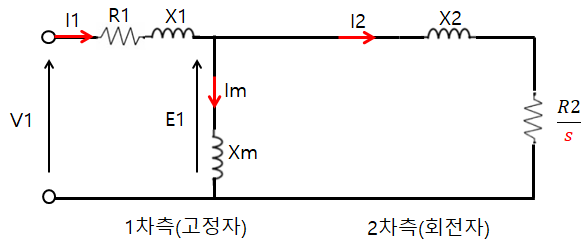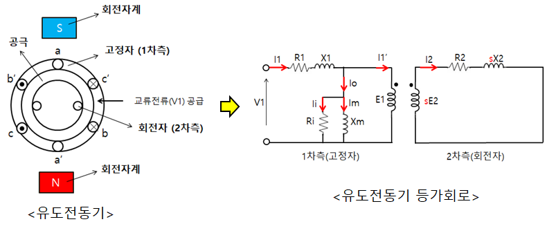 1차측 고정자를 통해 입력된 전압(V1)은 2차측 회전자로 전달 된다.