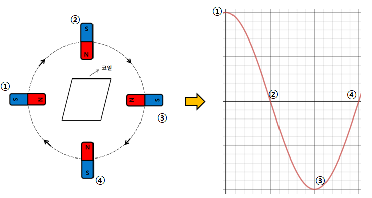 그러므로 코일 주변을 자석이 한바퀴 돈다고 생각해보면 코일에 생성되는 전기에너지는 다음과 같은 그래프로 나타낼 수 있다.