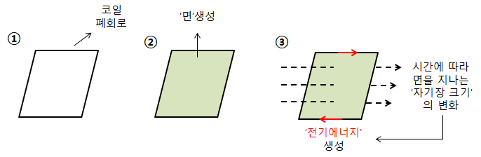 바로 이 면을 지나는 자기장의 크기가 시간에 따라 변하면 코일에 전기에너지(E)가 생성되는 것이다.