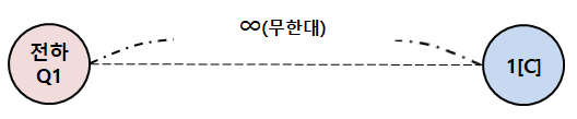 이때 1[C]이 위치한 곳을 '영전위 기준점'이라고 하며 둘 사이에 힘이 작용하지 않으므로 0[V]이다.
