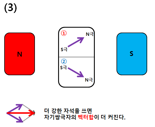 (3) 자성체에 조금 더 강한 자석을 가져다 대면 ①,②의 자기쌍극자는 자석의 극을 따라가는데 약한 자석일 때 보다 더 많이 끌려가므로 자기쌍극자의 벡터합이 더 커진다.