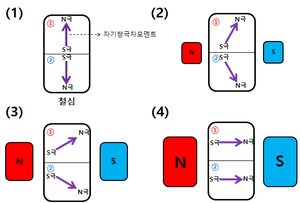 (2) 철심에 작은 자석을 가져다 놓으면 자기쌍극자는 자석의 N극과 S극을 따라 조금 움직이게 된다. 그러면 철심의 자기쌍극자모멘트 ①② 의 벡터합은 '0'이 아니게 된다.