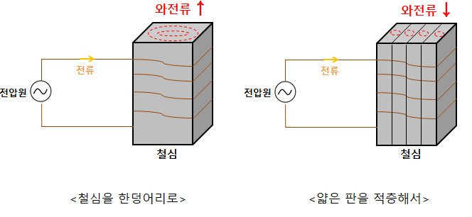 철심에 전류를 흘리게 되면 자기장 변화에 의해 철심의 면에 '와전류'가 발생하면서 '와전류 손실'에 의해 철심에 열이 발생하고 전력손실이 발생하게 된다.