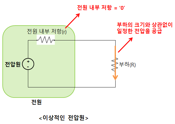내부저항이 '0', 일정한 전압을 공급한다면 '이상적인 전압원'이다.