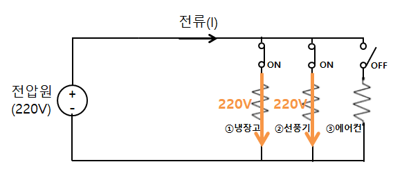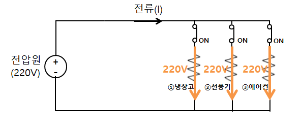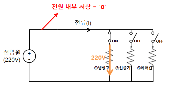 냉장고, 선풍기, 에어컨에 모두 일정하게 전압원이 공급하는 220V가 걸리게 된다.
