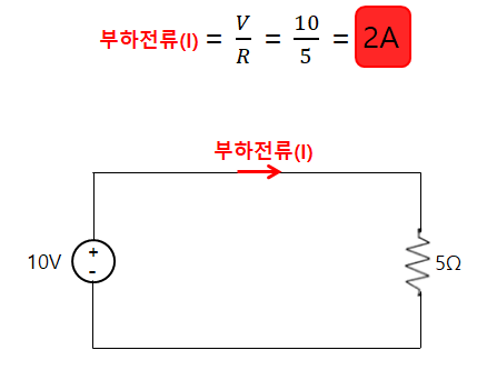 공급 전압이 10V라고 하고 부하가 5Ω이라고 할 때 오옴의 법칙(I=V/R)에 따라서 2A의 전류가 흐른다.