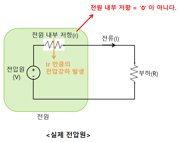 전원 내부 저항(r)이 값을 가지고 있기 때문에 I(전류) x r(내부저항) 만큼의 전압강하가 전원에서 발생한다.