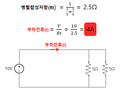 부하가 늘어서 5Ω이 한 개 더 추가되면 부하전류가 4A 흐르게 된다.