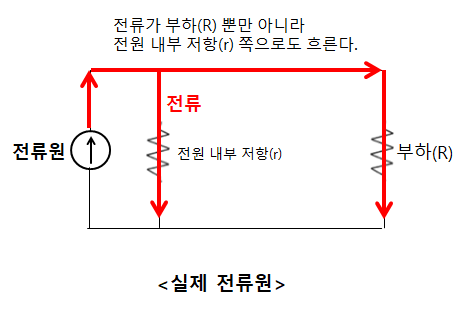 전원 내부 저항(r)이 무한대가 아니고 어느정도 높은 값을 가진다. 그래서 전류가 부하(R) 쪽 뿐만 아니라 전원 내부 저항(r) 쪽으로도 흐르게 된다.
