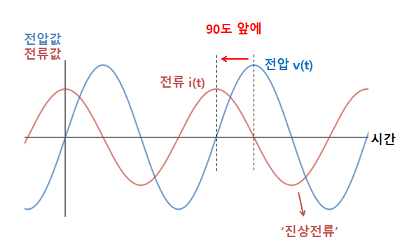 이렇게 전압보다 전류가 90도 앞서는 전류는 '진상전류'라고 한다.