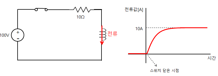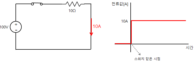 오른쪽 그래프는 스위치 닫은 시점에 회로로 흐르게 되는 전류를 그래프로 표현한 것이다.