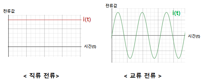 직류전류는 시간에 따라 전류값이 일정하고 교류전류는 시간에 따라 전류값이 +,-를 계속 반복하며 바뀐다.