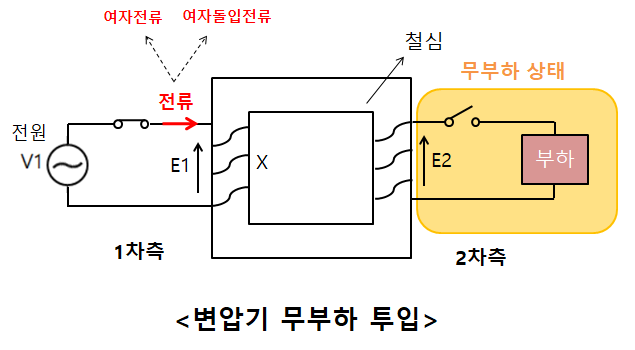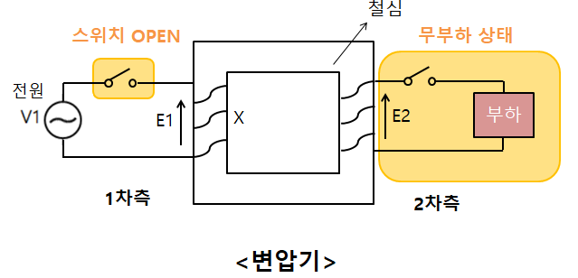 2차측 역시 부하로 연결된 스위치는 열려있어 부하에 전류가 전달되지 않는 '무부하 상태'이다.