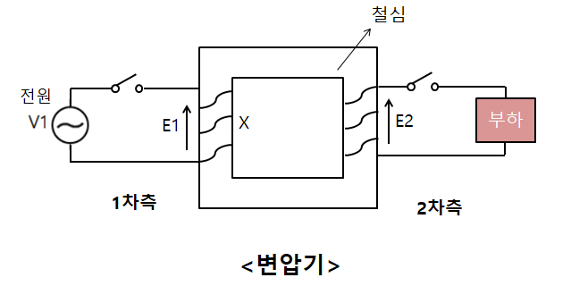 1차측 전원의 전압값(E1)이 변압기를 거치면 2차측에서 원하는 전압값(E2)으로 변환된다.