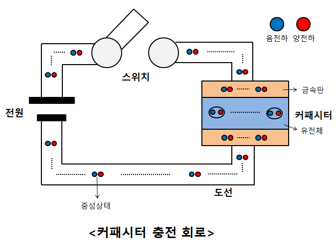 커패시터 금속판 하단에는 음전하가 들어오면서 전기에너지가 생기게 된다.
