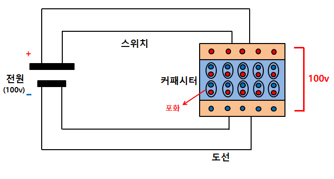 유전체의 양성자와 구속전자가 금속판의 극에 맞게 서서히 움직여나가다가 어느 순간 포화가 된다. 그러면 커패시터는 전원의 전압인 100V를 모두 충전하게 되고 더 이상 도선과 커패시터에는 전류가 흐르지 않게 된다.