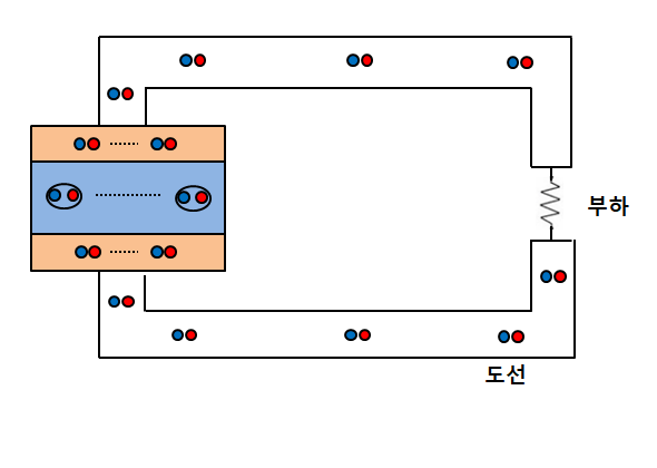 이런 음전하(전자)의 흐름이 도선에서 전류로 나타난다.