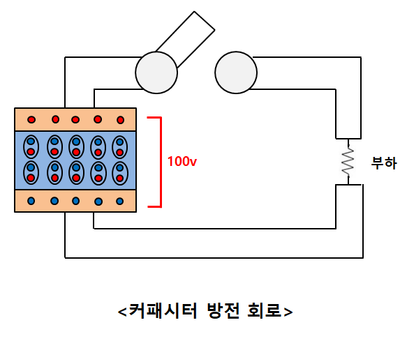 커패시터 금속판 하단의 전자들이 빠져나오면서 부하를 거쳐 금속판 상단으로 이동한다. 이 과정에서 전류가 발생하고 부하에서 에너지 소모가 생긴다. 또한 움직인 음전하가 양전하와 결합하면서 중성상태가 되기 때문에 커패시터의 양단은 전하를 잃으면서 전압이 점점 떨어진다.