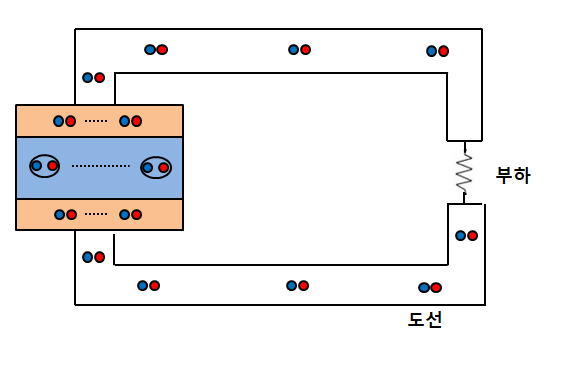 전원에 의한 전압 변화가 생기면서 음전하(전자)의 이동으로 전류가 발생한다.