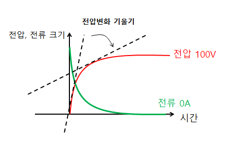 최초 콘덴서(condenser)를 투입할 때 전압의 변화율(기울기)이 가장 크므로 아주 큰 전류가 흘렀다가 안정되기 시작한다.