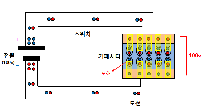 전원의 100V가 커패시터에 모두 걸리고 전압변화가 없어지면서 음전하(전자)가 이동하지 않게 되어 전류가 흐르지 않는다.