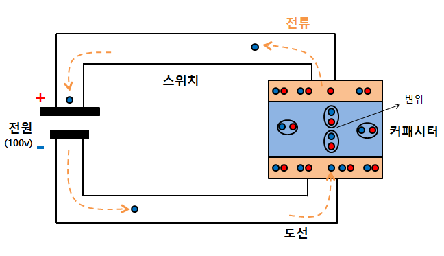 커패시터 금속판 상, 하단 사이에 전위차가 발생한다. 전압 변화가 발생하면서 커패시터 금속판 하단의 음전하가 커패시터 금속판 상단으로 이동한다. 도선을 타고 음전하(전자)가 이동하면서 전류가 나타난다.
