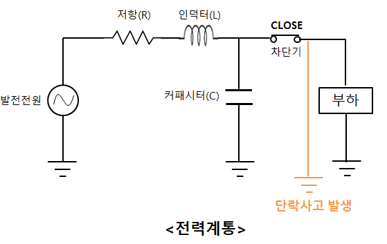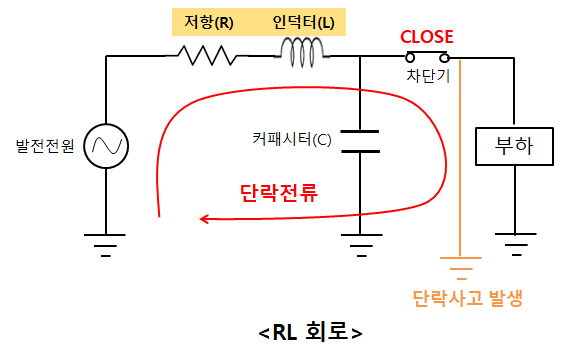 이때 커패시터의 임피던스에 비해 단락사고 발생 쪽의 임피던스가 훨씬 작기 때문에 커패시터 쪽으로는 전류가 흐르지 못하게 되어 RL회로이다.