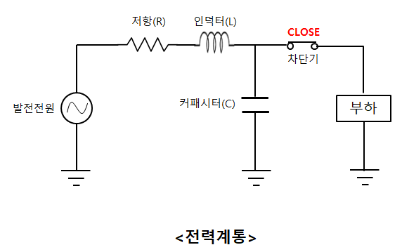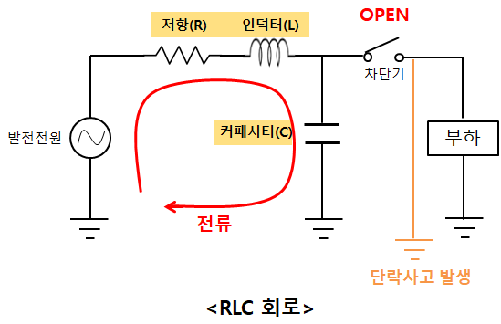 차단기가 OPEN 되면 차단기 쪽은 무한대의 임피던스를 가지게 된다. 그래서 그에 비해 임피던스가 작은 커패시터 회로 쪽으로 전류가 흐르게 된다. 그러면 RLC회로가 된다.