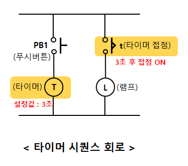 타이머를 3초로 설정해 놓으면 푸시버튼(PB1)을 누른 뒤 3초 후 타이머 접점이 붙게 된다.