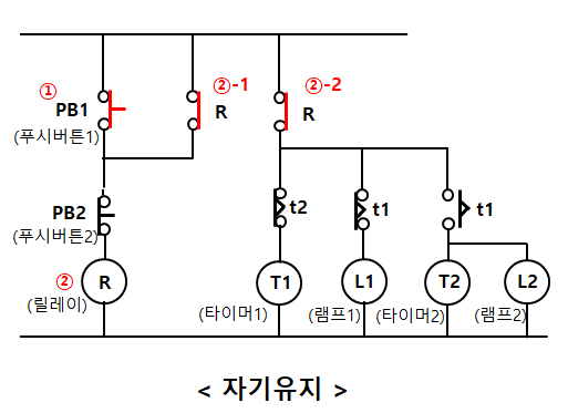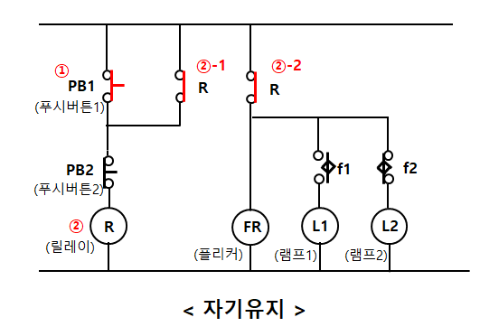 ②-1 릴레이가 여자되면서 릴레이 접점이 닫힌다. 그러므로 푸시버튼(PB1)에서 손을 떼도 자기유지가 된다.