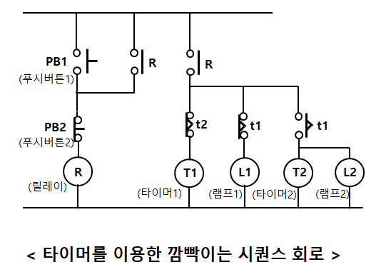 (1) 푸시버튼, 릴레이 자기유지, 타이머를 이용한 깜빡이는 시퀀스 회로
