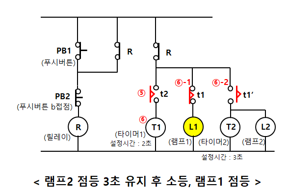 ⑥-2 타이머1의 a접점(t1')이 떨어지면서 램프2가 소등된다.