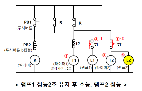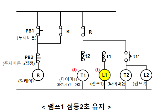 ③-1 타이머1의 설정시간을 2초라고 하면 2초 후에 타이머1의 b접점(t1)이 떨어지며 점등되어 있던 램프 L1이 소등된다.