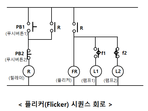 아래 회로는 푸시버튼(PB1), 플리커(FR), 램프2개(L1,L2)를 이용하여 램프 2개를 시간마다 번갈아가며 깜빡이게 만든 회로이다.