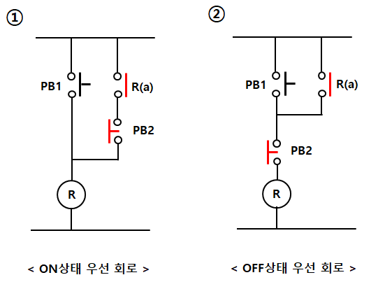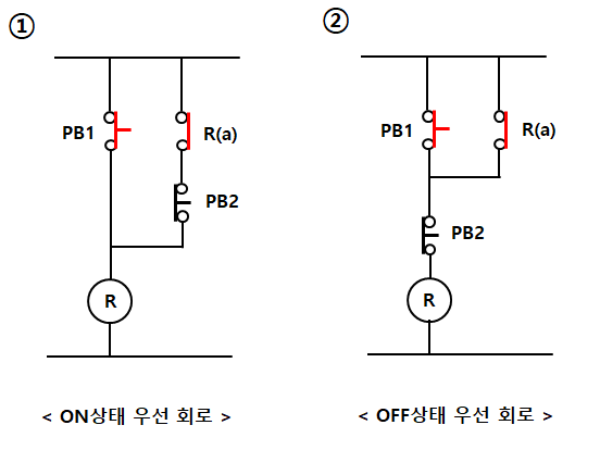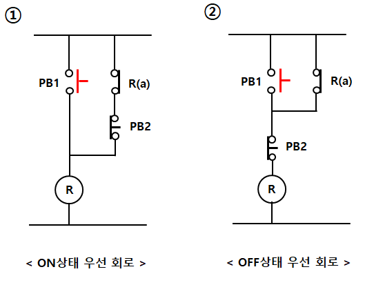 ①번 회로는 PB1과 PB2를 동시에 눌렀을 때 릴레이까지 전류가 흐를 수 있어서 회로에 전류가 계속 공급할 수 있는 상태이고 (ON상태를 우선으로 취한다.)