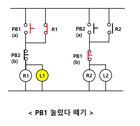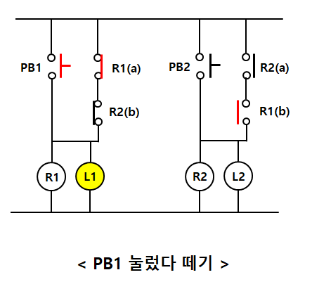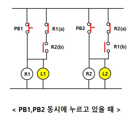 PB1, PB2를 누르면 R1,R2 b접점이 떨어지면서 서로의 흐름을 방해하지만