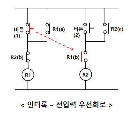 먼저 버튼(1)을 누르게 되면 상대버튼(2)을 눌렀을 때 릴레이(R2)로 가는 길을 끊어버리기 때문에