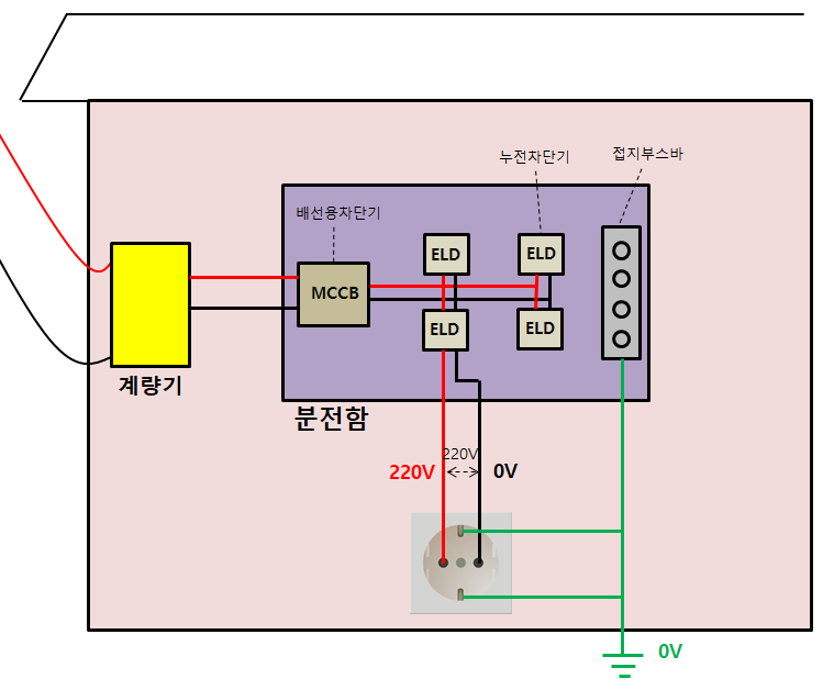 또한 분전함의 접지부스바에 연결된 녹색 접지선은 콘센트의 쇠부분에 연결되어 접지된다. 땅에 접지되어 있으므로 녹색선은 0V의 전위를 가진다.