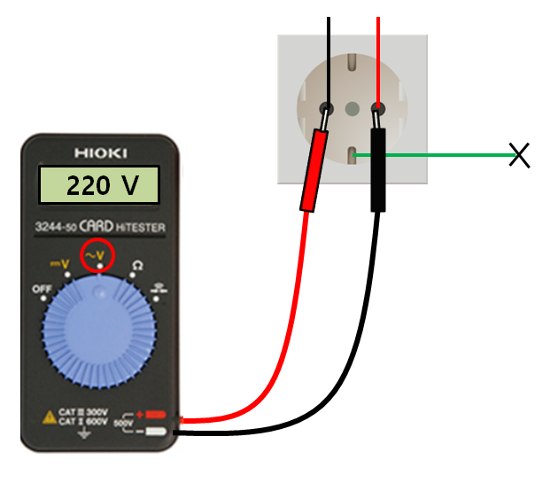3. 당연히 오른쪽 구멍에 리드봉을 꽂고 쇠부분(접지)에 리드봉을 대면 220V가 측정되고 (핫라인 전위 : 220V, 접지 전위 : 0V)