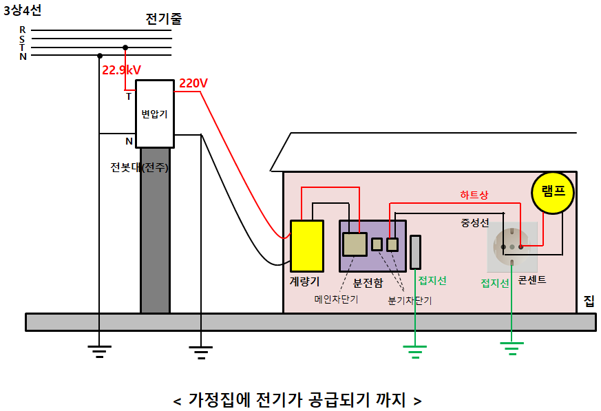 R,S,T 중 한 개의 선을 뽑아서 전봇대 위의 변압기를 거치면 전위는 220V로 줄어든다. 이렇게 들어온 빨간선은 하트상이다.
