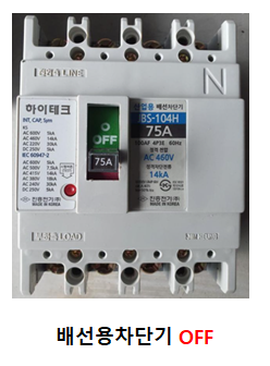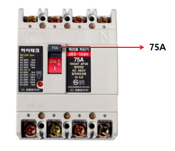 아래의 배선용 차단기를 보면 75A 허용전류임을 볼 수 있다.