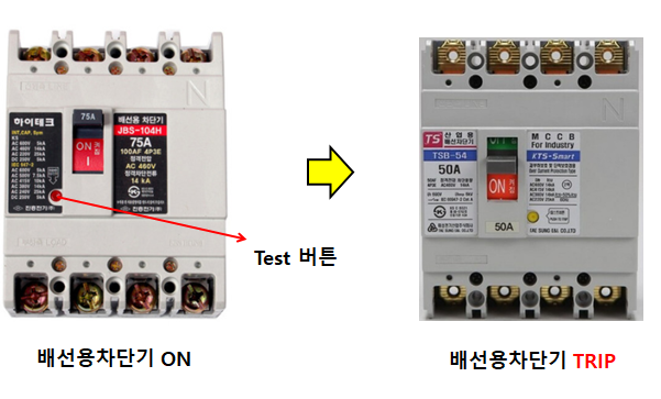 배선용 차단기를 보면 빨간색 Test 버튼을 볼 수 있다.