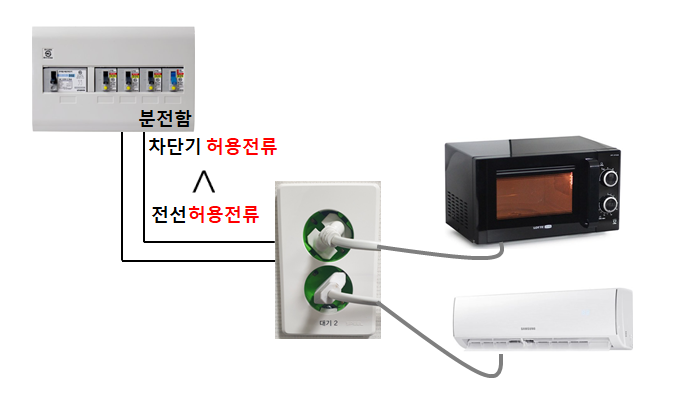 내선규정에 '전선의 허용전류'가 분전함 '차단기의 허용전류'보다 더 크도록 설치해야 한다고 되어 있다.