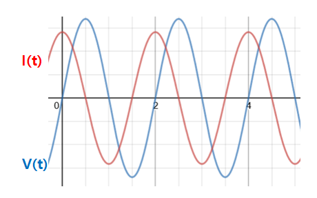 그래프에서 전류가 전압보다 90도 앞섬을 볼 수 있다.