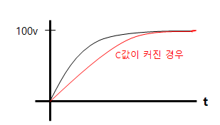 위의 그래프처럼 C값이 커지면 100V까지 도달하는 시간이 길어진다.
