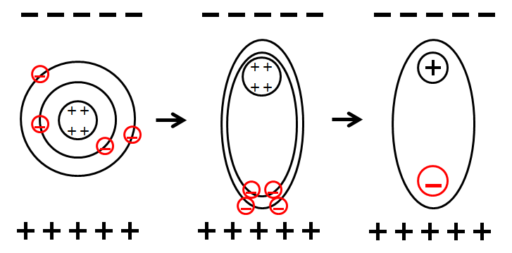 이상적인 유전체는 자유전자가 없고 구속 전자로 이루어져 있다. 금속판 양단에 전압이 걸리면서 위의 그림처럼 위의 금속체가 - , 아래 금속체가 + 전압을 띄게 되면 유전체의 구속 전자들은 +로 이동하게 되고 유전체의 +는 금속판의 -극 쪽으로 서서히 이동하게 된다. 시간이 지나고 나면 유전체의 +극들이 금속판의 -극쪽에 대부분 가게 되고, 유전체의 -극들이 금속판의 +극쪽에 대부분 가게 되는데 이를 분극이라고 하며 '전기쌍극자'라고 부른다.