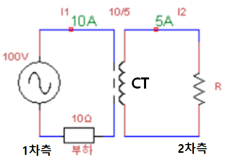 1차측에 흐르는 전류는 전압원과 부하에 의해 정해져있다. 전압이 100V, 부하가 10Ω 라면 옴의 법칙에 따라 100/10 = 10A 전류가 1차측에 흐르게 된다. 이때 CT비가 10/5라면 1차측의 10A 전류는 2차측에서 5A로 흐르게 된다.