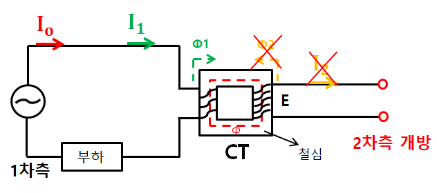 2차측이 개방되면서 2차측 전류 I2가 없어지게 되고 I2가 없어짐에 따라 노란색 자속(Φ2) 역시 사라진다. 그러면 CT자성체에 빨간색 주자속(Φ)과 녹색 자속(Φ1)이 남게 된다. 철심은 여자전류(Io)에 의해 자화되도록 설계되어있는데 Io보다 훨씬 큰 1차측 부하전류 I1도 철심에 남게 되면서 철심은 포화되어버린다. 2차측에 걸리는 전압 E=-N·(dΦ/dt)를 따른다. 즉 철심에 걸리는 자속Φ의 기울기 x 코일감은수 가 2차측에 걸리는 전압이다. 빨간색 주자속(Φ) 만 있을 때의 자속의 기울기는 아주 작지만, 녹색 자속(Φ1)이 더해지면서 아주 큰 기울기를 만들고 철심이 포화가 되면서 주기마다 서지전압(Surge Volage)을 발생시켜 절연파괴를 야기할 수 있다.