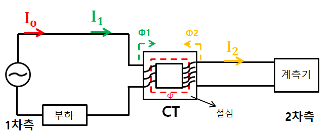 2차측에는 CT비에 의해 생긴 전류 I2가 생성되며, I2는 노란색 자속(Φ2)를 생성한다.