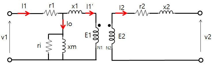 - 위의 회로에서 보듯이 1차부하전류(I1), 2차부하전류(I2)가 존재하고 여자전류(Io)에 대해서는 고려하지않는다. 여자전류에 관한 회로는 생략되어있다.(*여자전류 : 변압기의 철심을 자화시키기 위한 전류)